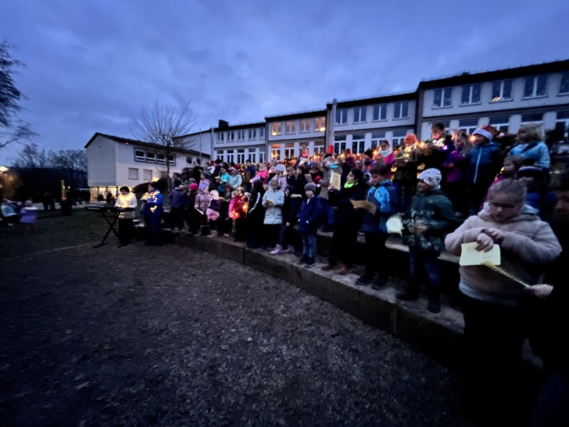 Alle Kinder waren zusammen mit ihren Eltern eingeladen. Um 16.00 Uhr trafen wir uns auf dem Schulhof. Viele Kinder und Erwachsene kamen mit Lichterketten oder kleinen Leuchten. So konnten alle auch im Dunkeln schön leuchten.