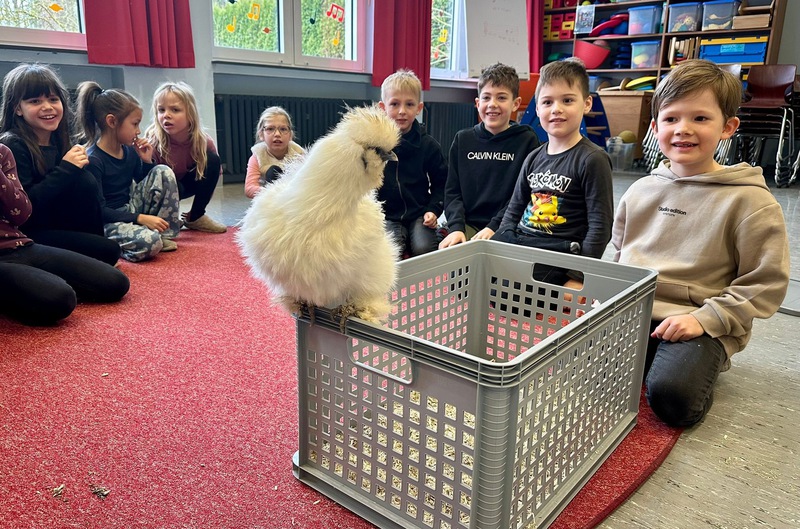 Für besonders große Begeisterung sorgten die tierischen Gäste, die unsere Schule besuchten: ein Hund, eine Katze und Hühner. Die Kinder konnten die Tiere aus nächster Nähe erleben und viel über ihre Haltung und Pflege erfahren. Eines der Hühner hinterließ uns sogar ein frischgelegtes Ei als Geschenk.