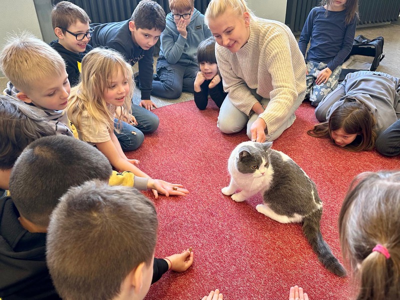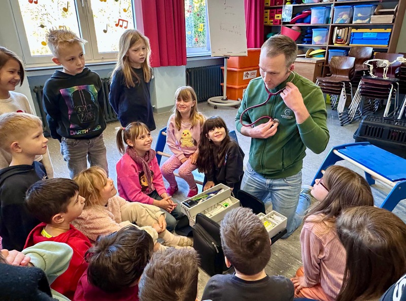Ein weiteres Highlight war der Besuch des Tierarztes Moritz Flörke, der den Schülerinnen und Schülern Spannendes aus seinem Arbeitsalltag berichtete. Er erklärte ihnen anschaulich, wie er Tieren hilft, wenn sie krank sind, und beantwortete zahlreiche Fragen der Kinder.